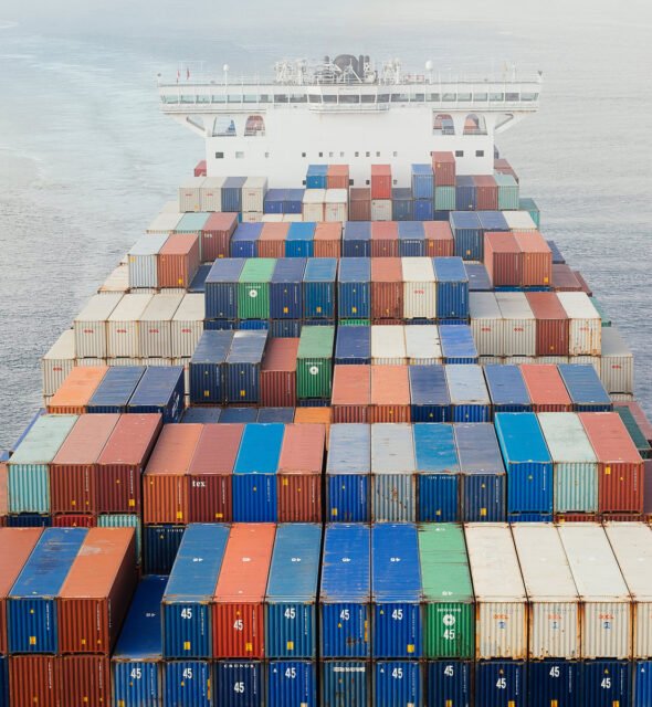 Witness global trade in motion as a mighty cargo ship navigates the vast ocean, symbolizing the interconnectedness of our world.